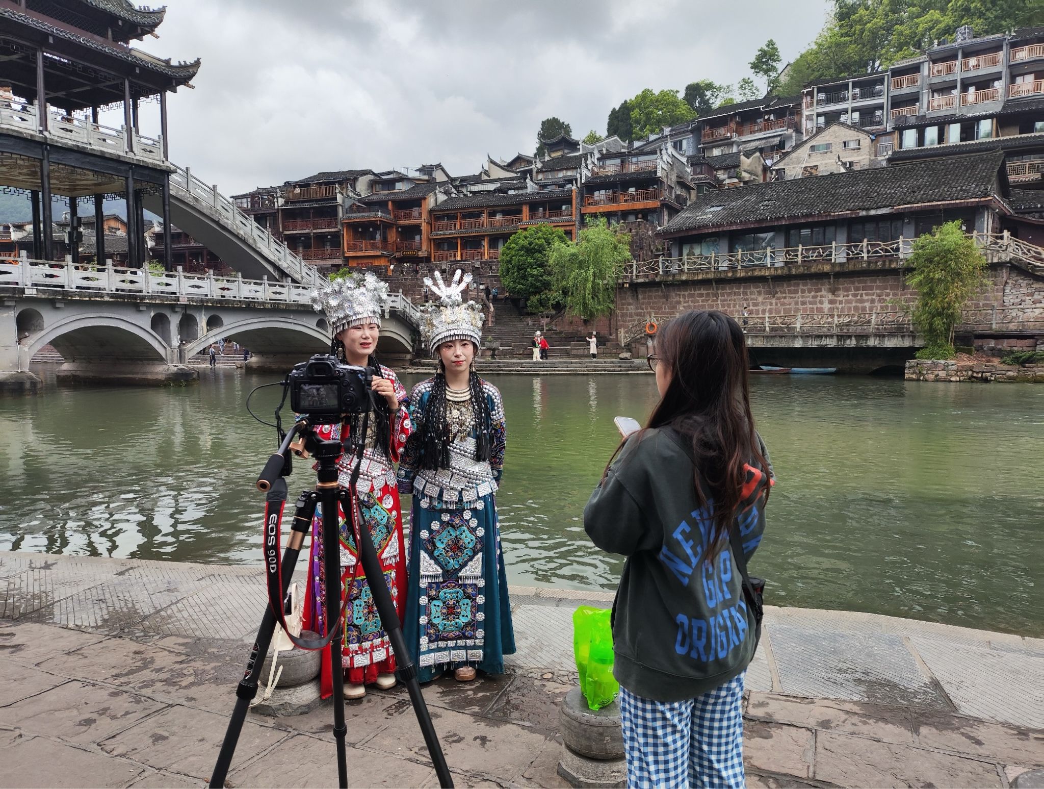 我们组在沱江边采访了两位穿着苗族传统服饰的小姐姐。 从小姐姐们的口中我们了解到她们来自武汉,最先是从沈从文先生笔下了解到了湘西的魅力,于是通过亲身穿着苗族服饰体验服饰背后蕴藏的民族故事。