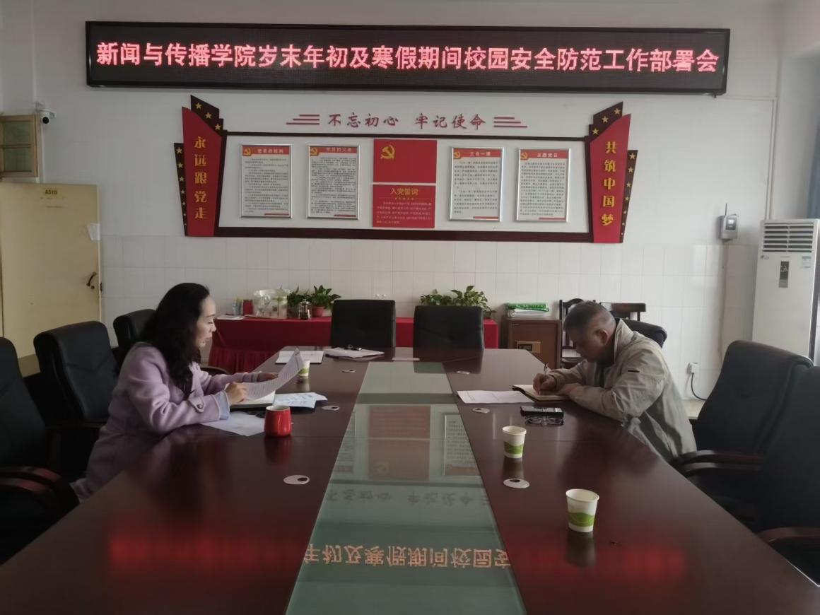 为落实学校安全工作要求,2025年12月30日,新闻与传播学院于仁智楼A510会议室召开岁末年初及寒假安全防范工作会议部署会,新闻与传播学院党总支书记何芳、副院长罗兵参会。会议围绕责任落实、重点领域防控及安全教育应急三方面进行安排,要求全员协同履职,系统排查消防、校舍、实验室、食品卫生、学生管理及交通等隐患,加强安全宣传,全力维护校园安全稳定。