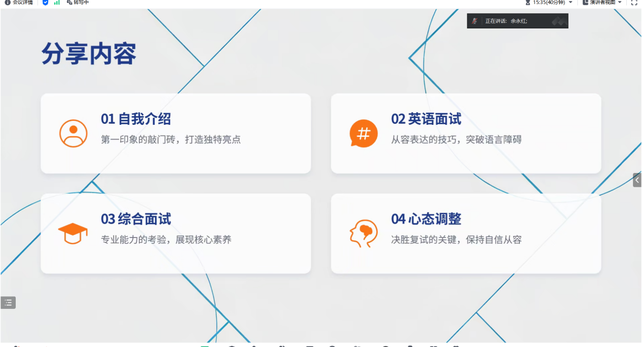 余永红学姐则瞄准考生最焦虑的面试环节,聚焦自我介绍、英语面试、综合专业面试、考前心态调整四大核心模块,做了系统且细致的策略讲解。从自我介绍的时长把控、内容取舍,到英语面试的高频话题、答题逻辑,再到综合面试的专业问答思路、临场应变技巧,她都一一拆解;针对考场可能出现的突发状况,比如突然卡壳、问题答不上来等情况,分享了实用的处置方法,还结合自身备考经历,给出了缓解考前焦虑、平稳心态的小妙招,帮大家放下心理包袱,从容应考。