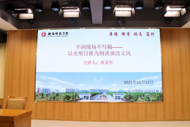 为锤炼新闻学子专业实践能力,推动新闻传播教育与业界前沿接轨,11月17日,衡阳师范学院宣传统战部特邀光明日报社主任记者、湖南记者站副站长禹爱华,以“不到现场不写稿——以光明日报为例谈谈改文风”为题,带来一场兼具理论深度与实务价值的专题讲座。前来聆听讲座的有新闻与传播学院2023、2024级新闻学本科专业学生、部分研究生和学校读者团成员共120余人。