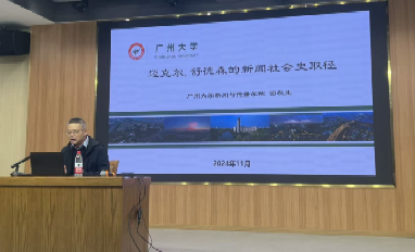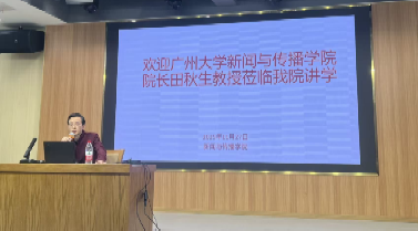 2025年11月27日上午,广州大学新闻与传播学院院长、广州市人文社科重点研究基地主任田秋生教授莅临我校,在仁智楼一楼演播厅作了题为“迈克尔·舒德森的新闻社会史研究取径”的专题讲座。新闻与传播学院副院长邓庄、罗兵,学院部分教师,学院全体研究生及2025级部分本科生,到场聆听。